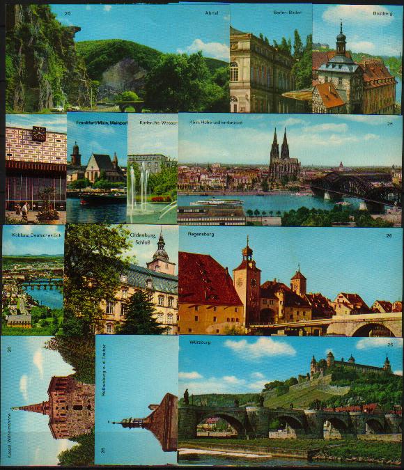 09: 13 verschiedene ZH-Präsent-Etiketten aus der BRD = € 3,00 mit Abbildungen aus Ahrtal, Baden-Baden, Bamberg, Braunschweig, Frankfurt/Main, Karlsruhe, Kassel, Köln, Koblenz, Oldenburg, Regensburg, Rotenburg o.d.Tauber und Würzburg.