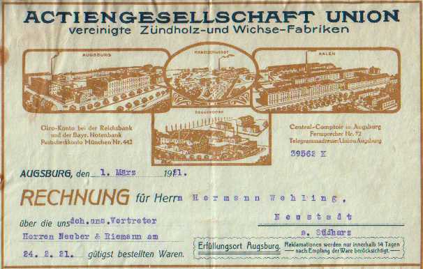 Rechnung von der ZH-Fabrik Union Augsburg aus dem Jahre 1921