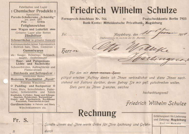Friedrich Wilhelm Schulze, Magdeburg - Grösstes Lager aller Sorten Zündhölzer