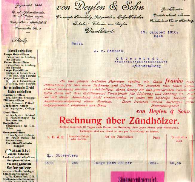 Rechnung der Fabrik von Deylen & Sohn, Visselhövede (V130) aus dem Jahre 1910