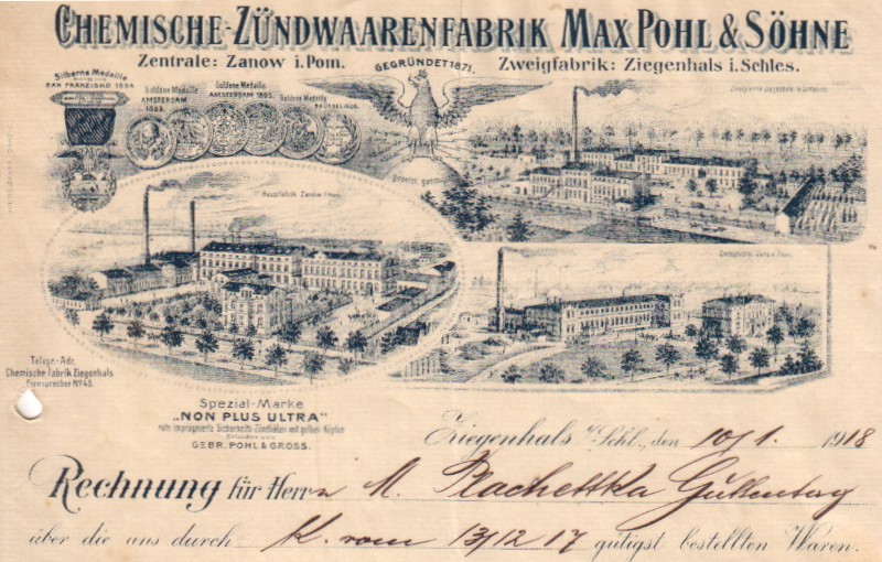 Rechnung der Firma Chemische-Zündwaarenfabrik Max Pohl & Söhne, Zweigfabrik: Ziegenhals in Schlesien (Z110)