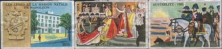 Frankreich hat wunderschöne Etiketten auf den Zündholzschachteln. Es gibt zahllose Serien über alle möglichen Themen; es ist eine Freude, diese zu sammeln. Nachstehend ist als Beispiel aus meiner Sammlung eine Etiketten - Serie über Napoleon mit dem dazu gehörenden Paketetikett abgebildet.