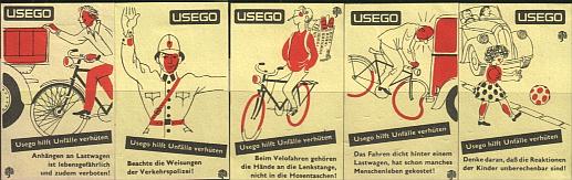 5 Etiketten aus einer aus 25 Etiketten bestehenden Serie der Ladenkette "Usego" zum Thema "Unfallverhütung".