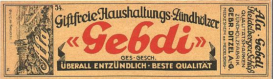 ZHF Badenia Gebr. Ditzel, Meckesheim gegr.: 15.10.1905 (M160), später Zündholz- und Wichsefabrik Gebr. Ditzel um 1914 und Zündholz- und Wichsefabriken Gebr. Ditzel AG ab 1923 - 1975
