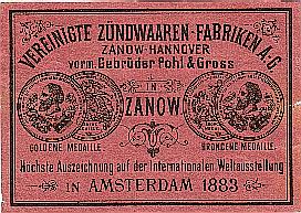 Vereinigte Zündwaarenfabriken AG, Zanow - Hannover von 1890 - 1897 (Z110)